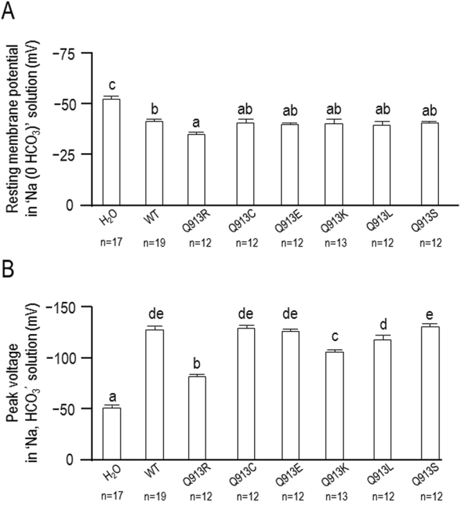Figure 6. Membrane potential (Vm) of oocytes expressing WT or Q913X mutants. (A) Average Vm of cells bathed in ‘Na (0 HCO3)’ solution. (B) Average of the most negative values of Vm achieved upon exposure of cells to ‘Na, HCO3’ solution. Within each panel, groups that do not share the same annotated letter are deemed significantly different by ANOVA with post hoc Tukey analysis, 95% confident limit. |