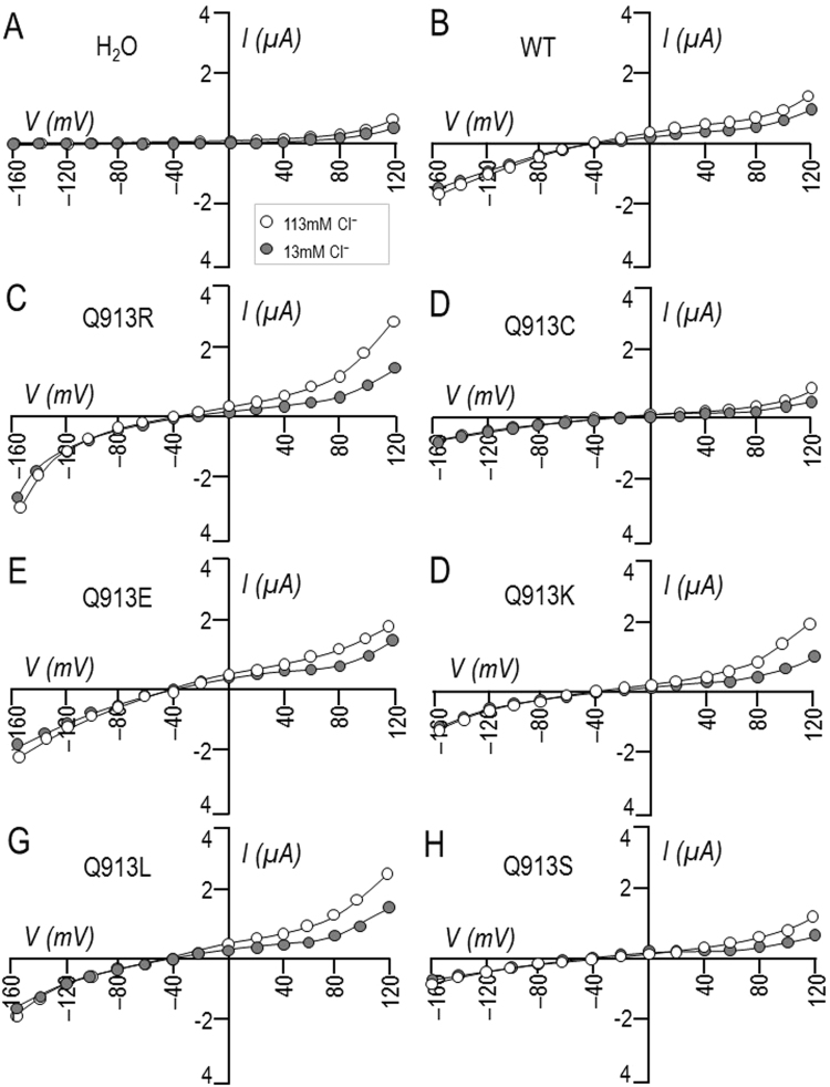 Figure 7. Effect of Cl− replacement on currents mediated by WT or Q913X mutants in Xenopus oocytes in the absence of HCO3−. (A) Representative current-voltage (I–V) relationship from a H2O-injected oocyte as it was sequentially exposed to ‘Na (0 HCO3)’ solution containing either 113 mM Cl− or 13 mM Cl−. (B–H) Equivalent data from oocytes expressing WT, Q913R, Q913C, Q913E, Q913K, Q913L, or Q913S. |