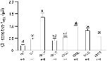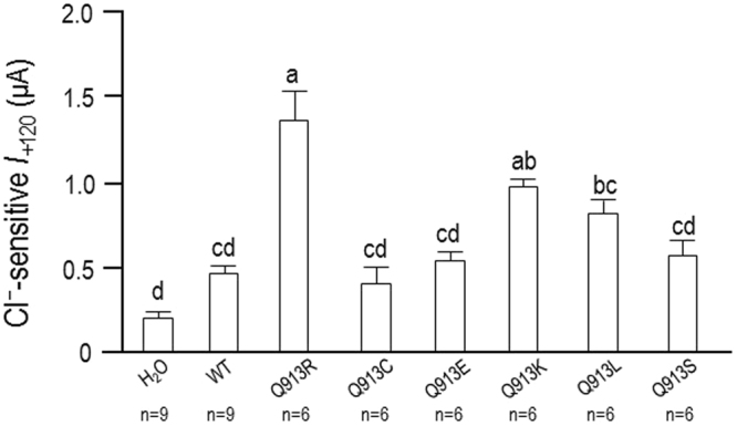 Figure 8. Cl−-sensitivity of the membrane current (I) of oocytes expressing WT or Q913X mutants. Bar chart shows the average decrease in current, measured at +120 mV, upon lowering of extracellular Cl− from 113 mM to 13 mM calculated from a larger set of I-V relationships such as those shown in Fig. 7. Groups that do not share the same annotated letter are deemed significantly different by ANOVA with post hoc Tukey analysis, 95% confident limit. |