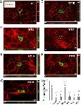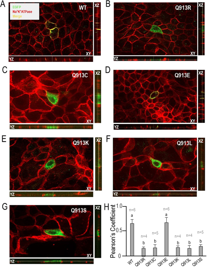 Figure 9. Distribution of WT or Q913X mutant NBCe1-A-EGFP in polarised MDCK−II Cells. (A) Representative WT transfected cells showing the distribution of NBCe1-EGFP and Na+-K+ ATPase in the XY, XZ, and YZ plane as disclosed by an anti-EGFP primary antibody following by an Alexa-488 conjugated secondary antibody (green) and anti-Na+-K+ ATPase followed by an Alexa-594 conjugated secondary antibody (red). (B–G) Equivalent representative from cells transfected with Q913R, Q913C, Q913E, Q913K, Q913L, and Q913S. (H) Bar chart showing the average Pearson’s coefficient values for co-incidence of EGFP immunoreactivity with Na+-K+ ATPase immunoreactivity. Groups that do not share the same annotated letter are deemed significantly different by ANOVA with post hoc Tukey analysis, 95% confident limit. |
