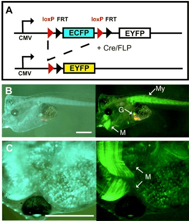 Muscleâspecific activation of the EYFP gene. (A) Schematic drawing of the reporter gene LCMV:ECFP(loxP)(FRT)EYFP containing the CMV promoter driving the expression of the ECFP and EYFP genes. The ECFP gene with its polyadenylation signal is flanked by loxP and FRT sites allowing Cre and FLP recombinaseâmediated deletion of the ECFP gene and thus leading to the expression of the EYFP gene. (B and C) Transgenic Xenopus generated by simultaneously introducing the reporter gene LCMV:ECFP(loxP)(FRT)EYFP and the Cre expression vector CARâCre that drives Cre activity by the muscleâspecific actin promoter (11). (B) Lateral view of a living larvae using filters to detect blue (ECFP, left) or yellow (EYFP, right) fluorescence. (C) Detailed ventral view of another larvae using the same filters. M, myofibrils of the jaws; My, myotomes of the tail; G, gall bladder with autofluorescence. The scale bars are 1 mm.