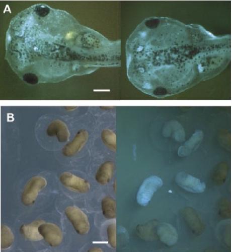 Figure 2. Founder animals at larval stage and F1 embryos. (A) Blue ̄uores- cence of two Xenopus larvae derived from a transgenic reaction with LCMV:ECFP(loxP) (FRT)EYFP. (B) Early tail bud stage embryos derived from the founder female C5 under normal light or blue ̄uorescence show that ~30% of the embryos are blue. The intensity of the blue ̄uorescence in F1 animals differs. The scale bars are 1 mm.