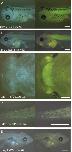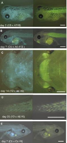 Figure 4. Muscle-speci�c recombination in crossings of Xenopus strains. (A�C) Eggs from reporter females containing the LCMV:ECFP- (loxP)(FRT)EYFP transgene were fertilized with sperm of transgenic Cre founder males expressing Cre under the control of the muscle actin pro- moter. Lateral (A and B) and ventral (C) views of larvae are given. The age of the larvae and the name of the founder animals are indicated for each panel. (D) Tail tip of a 28 day larvae in the region of gradual muscle differ- entiation. (E) Lateral view of a larvae obtained by the crossing of the repor- ter founder female C5 containing the LCMV:ECFP(loxP)(FRT)EYFP transgene with a control male lacking Cre recombinase. The left and right panel show the blue and yellow ̄uorescence, respectively. The scale bars are 1 mm.