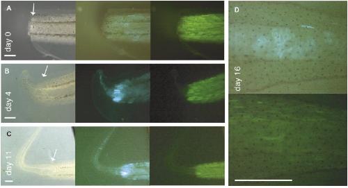 Figure 5. Muscle cell labeling in the regenerating Xenopus tail. Larvae derived from crossings between C5 and A6 that contain yellow muscle were grown up to stage 52 (day 28) and the tail tip was removed (see Fig. 4D). (A�C) Pictures in normal light, blue and yellow ̄uorescence are given at various times after tail removal. The border between the tail stump and the regenerate is marked by an arrow. (D) Close-up of a regenerated tail tip in blue (top) and yellow ̄uorescence (bottom) at day 16. The scale bars are 1 mm.