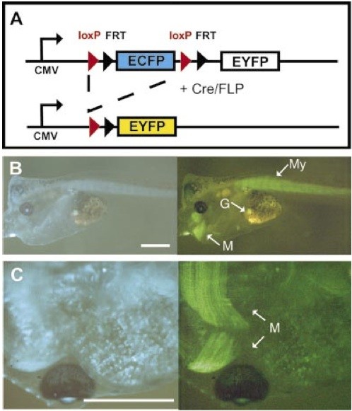 Figure 1. Muscle-speci�c activation of the EYFP gene. (A) Schematic drawing of the reporter gene LCMV:ECFP(loxP)(FRT)EYFP containing the CMV promoter driving the expression of the ECFP and EYFP genes. The ECFP gene with its polyadenylation signal is ̄anked by loxP and FRT sites allowing Cre and FLP recombinase-mediated deletion of the ECFP gene and thus leading to the expression of the EYFP gene. (B and C) Transgenic Xenopus generated by simultaneously introducing the reporter gene LCMV:ECFP(loxP)(FRT)EYFP and the Cre expression vector CAR-Cre that drives Cre activity by the muscle-speci�c actin promoter (11). (B) Lateral view of a living larvae using �lters to detect blue (ECFP, left) or yellow (EYFP, right) ̄uorescence. (C) Detailed ventral view of another larvae using the same �lters. M, myo�brils of the jaws; My, myotomes of the tail; G, gall bladder with auto ̄uorescence. The scale bars are 1 mm. The two double transgenic animals shown were derived from an experiment using 2900 injected eggs. We obtained 118 larvae of stage 35 (20) and 51 larvae were transgenic as assayed by ECFP ̄uorescence. Fifteen transgenic animals reached the swimming larval stage and two showed EYFP expres- sion in the muscle. The larvae in (B) has abnormal morphology. The use of egg extract in this experiment explains the low frequency of healthy tadpoles.