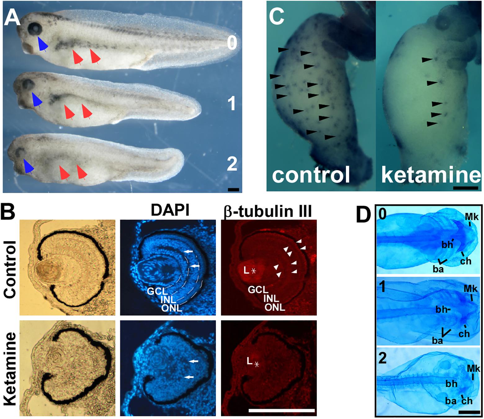 FIGURE 1. Ketamine exposure results in neurocristopathies. Upon ketamine exposure from stage 7 to stage 13.5. (A) Embryos exhibit shortened axis, faded trunk pigment (red arrowhead), and deficient eyes (blue arrowhead) at tailbud stage and severity of phenotypes are in a dose-dependent manner. (B) Sections of eyes in ketamine-treated embryos revealed a more rounding shape pigment, disorganized arrangement of cells (DAPI staining), reduced expression of β-tubulin III compared with the control group. Ketamine exposure also causes embryos to develop a mega-colon like phenotype (C), and cranial cartilage atrophy (D). GCL, ganglionic cell layer; INL, inner nuclear layer; ONL, outer nuclear layer; L, lens; Mk, Meckelâs cartilage; ch, ceratohyal cartilage; bh, basihyal cartilage; ba, branchial cartilage. Numbers in (A,D) indicate ketamine exposure concentration (mM) to embryos. Scale bar: (AâC) 100 μm, (D) 1 mm. |