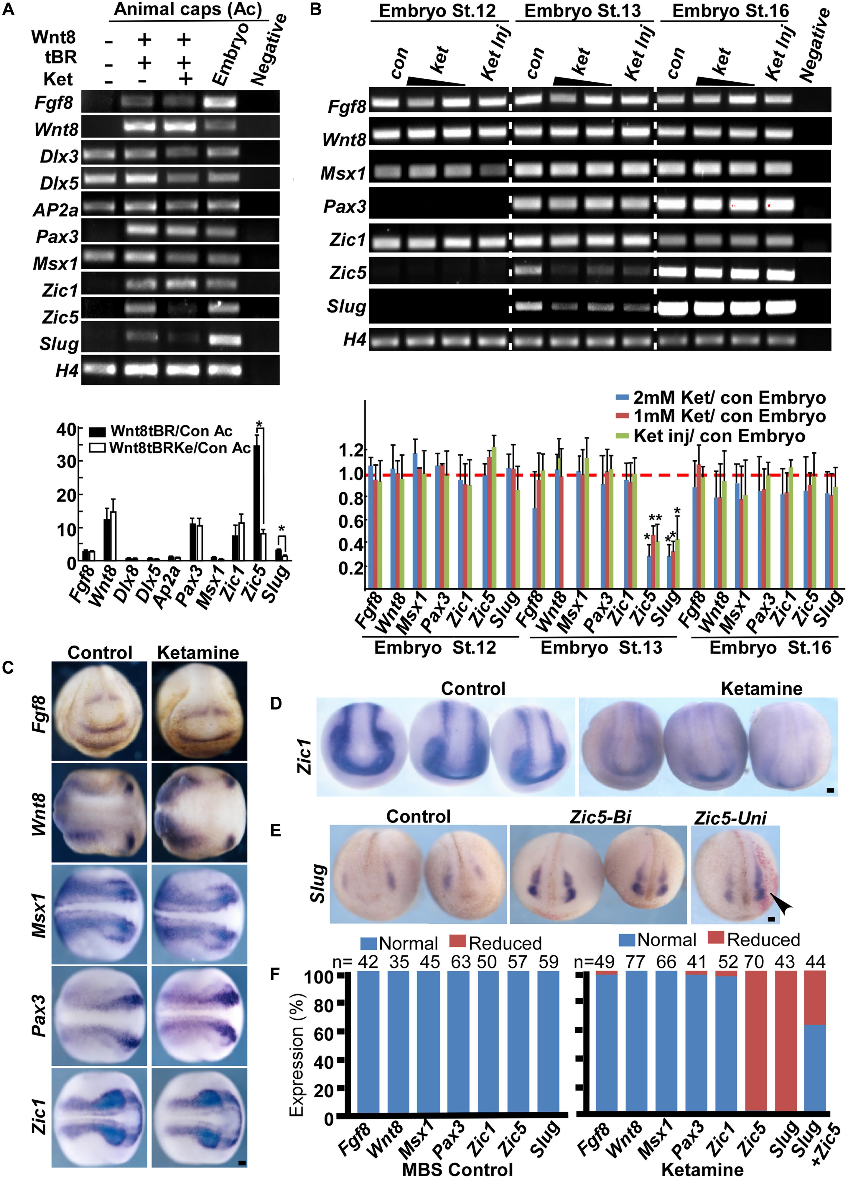 FIGURE 3. Ketamine targets Zic5 in NC induction. (A) In animal caps, Wnt8 (500 pg) and tBR (500 pg) induce expression of NC markers (lanes 1, 2). Upon ketamine exposure, the expression of Zic5 and Slug were inhibited (lanes 2, 3). The induced expression of Zic5 and Slug were reduced by ketamine treatment in animal cap. Gene expressions were normalized with H4. Data are shown as folds over the control animal caps. 15 animal caps were isolated for each group for single time experiments. The number represents Mean ± SEM, N = 3, âP < 0.05 by ANOVA. (B) In whole embryos, either ketamine exposure or injection (0.8 nmol/embryo) blocked Zic5 and Slug expression at stage 13 (when the NC is being induced) but not stage16 (at the onset of NC migration). Ketamine treatment did not affect most of the border genes from stage 12 to stage 16, but significantly blocked Zic5 and NC gene Slug at stage 13. For a single time experiment, 10 embryos were collected for each group for RT-PCR. Data are shown as folds over the control embryos. The number represents Mean ± SEM. N = 3, âP < 0.05 by ANOVA. (C) In situ hybridization suggests genes involved in NC induction, including Fgf8, Wnt8, Msx1, Pax3, and Zic1 were not affected by ketamine exposure. (D) Ketamine inhibited Zic5 expression comparing with MBS cultured control group. (E) The inhibition of Slug expression by ketamine was rescued by injection of Zic5 mRNA (500 pg) in both sides or unilaterally. Arrowhead indicate the unilaterally injected side. (F) Quantitative analysis of in situ hybridization results, left: MBS control group, right: ketamine exposure group. âP < 0.05 with t-test. Con, control; Ket, ketamine; Ket Inj, ketamine injection; St., stage; Zic5-Bi, zic5 bilateral injection; Zic5-Uni, zic5 unilateral injection. Scale bar: 100 μm. |