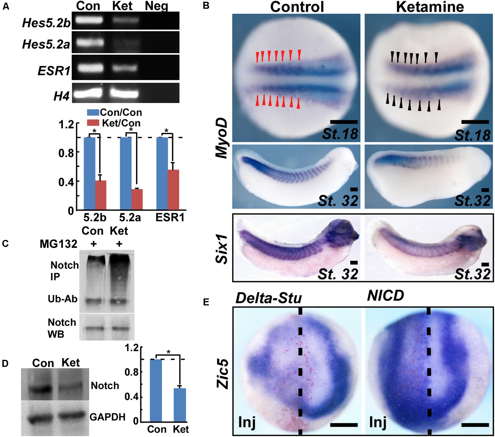 FIGURE 4. Ketamine inhibits Zic5 through the Notch signaling pathway. (A) During NC induction, ketamine exposure down-regulated expression of Notch targeted genes including Hes5.2a, Hes5.2b, and ESR1. The number represents Mean ± SEM, N = 3, âP < 0.05 by Studentâs t-test. (B) In the late neurula, MyoD transcription in early somite primordium became a little bit thin and slightly reduced the signal upon ketamine exposure. At tailbud stage, ketamine led to fewer somites and a shortened body axis. The somites are labeled with in situ hybridization of MyoD, and Six1. (C) Ketamine exposure increased the amount of ubiquitinated Notch protein in Jurkat cells. Upper part: ubiquitinated Notch proteins were immuno-precipitated (IP) with Notch-1 antibody, followed by anti-ubiquitin antibody (Ub-Ab) western blot staining. Lower part: Notch-1 loading control. (D) In Jurkat cells, ketamine exposure for 10 h reduced Notch protein level. The number represents Mean SEM, N = 3, P < 0.05 by Studentâs t-test. (E) During NC induction, inhibiting Notch signaling by microinjection of 1 ng Delta-stu mRNA at 4-cell stage blocked Zic5 expression. Activation of Notch signaling by microinjection of 800 pg NICD mRNA into one dorsal cell at 4-cell stage induced ectopic Zic5 expression. Scale bar: 100 μm. |