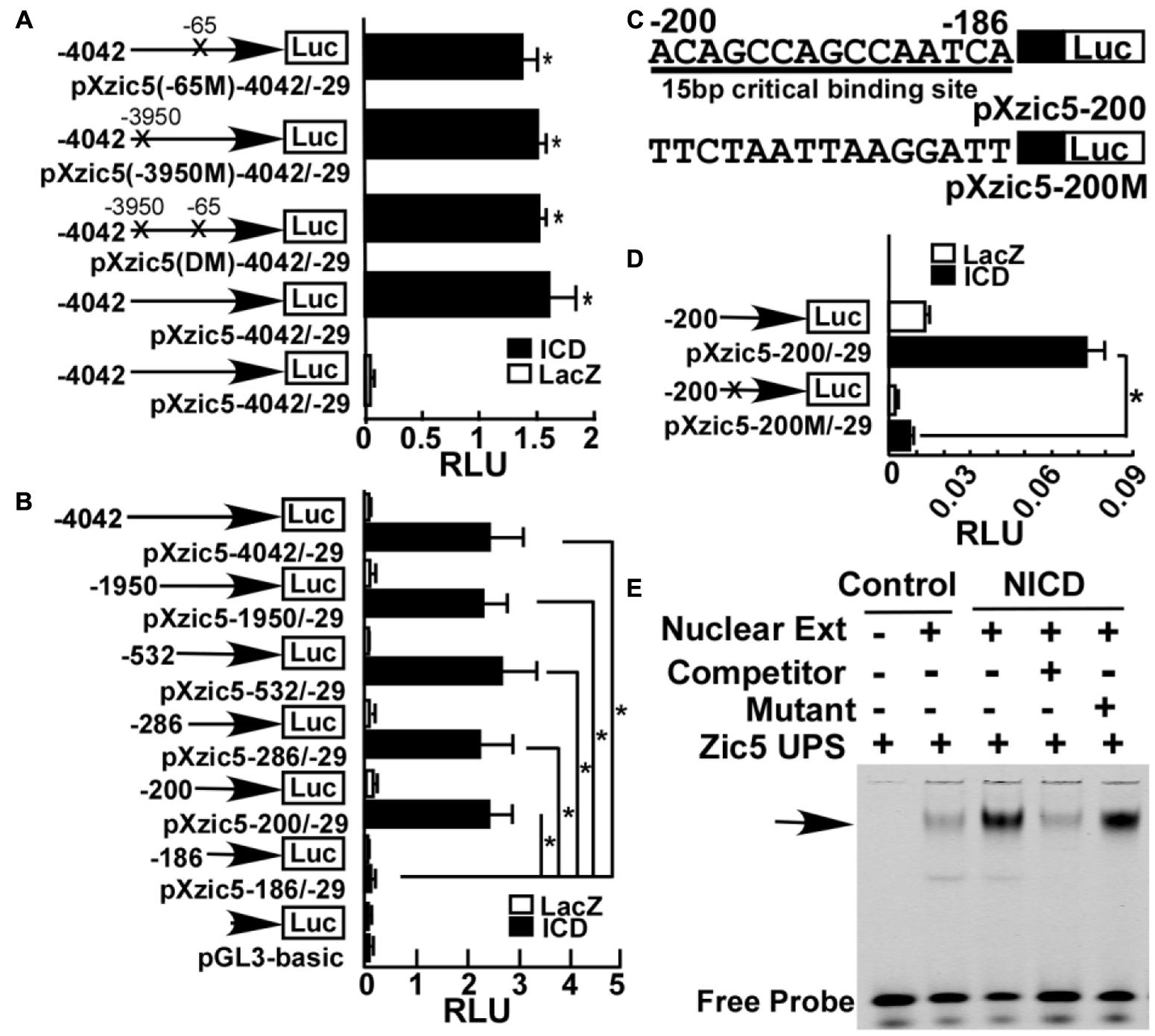 FIGURE 5. Identification of a novel NRE in Xenopus Zic5. (A) A ∼4 kb region (-4042 to -29) upstream of Zic5 contains a Zic5 promoter. Mutations of two putative canonical CSL binding sites within this 4 kb region did not affect notch’s activation of promoter activity. X’s represent the mutated site. (B) Deletion assay of Zic5 upstream regulatory sequence identified a 15 bp NRE locating between -200 and -186 bp in response to NICD activation. P-values relative to -186/-29 fragment are -200/-29 (P = 0.004); -286/-29 (P = 0.015); -533/-29 (P = 0.013); -1950/-29 (P = 0.004); -4042/-29 (P = 0.014). (C) Diagram of the constructs containing 15 bp CSL sequence and mutations in the promoter constructs. pXZic5-200 represents the wild-type and pXZic5-200M represents the 15 bp CBS mutant plasmid. (D) Mutation of the 15 bp CBS (pXZic5-200M) abolished the activation triggered by NICD in the reporter assay; P = 0.0017. (E) EMSA assay; NICD expression increased protein binding to the 15 bp NRE (see section “Materials and Methods”). The number represents Mean ± SEM, N = 3, ∗P < 0.05 with the post hoc Newman–Keuls test. RLU, relative luminant unit; Nuclear Ext, nuclear extraction; Zic5 UPS, fluorescent-labeling zic5 upstream Notch response element. |
