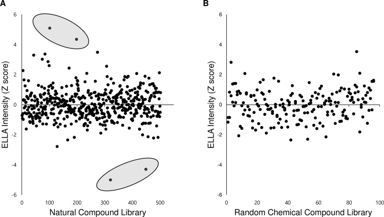 Fig 3. High throughput screening yielded putative muco-active reagents from the compounds library.A. The result of natural compound library screening. Data were analyzed by calculating the Z-score which indicates how far an individual score is away from the mean of a data set. Four putative muco-active reagents which have a Z-score over 4 or below -4 were selected for further analysis. B. The screening results of a random chemical library from NCBI. The random chemical library did not yield any muco-active reagents.
