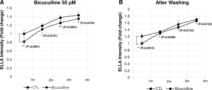 Fig 5. Bicuculline reversibly inhibits mucus secretion.Mucus secretion was analyzed in the presence of 50uM of bicuculline (A) or after changing the media without bicuculline at every 30 min (B). Mucus secretion was restored within 1 hour after removing bicuculline. P-values were calculated from student’s t-test (n = 4).