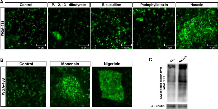 Fig 6. Ionophoric antibiotics narasin inhibits mucus secretion.A. The mucus granules were stained with WGA-Alexa 488 to visualize retained mucus granules. Narasin treated goblet cells (last panel) displayed severe retention of mucus granules. B. Ionophoric antibiotics, Monensin and Nigericin, inhibit mucus secretion similar to narasin. C. Narasin treatment increased intracellular levels of glycosylated protein.