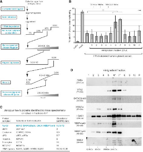 Figure 2. Isolation and Identification of the Y RNA-Independent Initiation Factor from Xenopus Egg Extracts(A) Schematic representation of the fractionation scheme.(B) Activity profile of the sucrose minigradient fractions. Template nuclei were incubated in Y RNA-depleted human cytosolic extract supplemented with the indicated gradient fractions. Percentages of replicating nuclei are shown as mean values ± SD of n = 4 independent fractionation experiments. Brackets indicate results of t tests (unpaired, two-tailed with unequal variance) of experimental samples (fractions 6 and 7) against the control (∗∗∗p ≤ 0.001). Tests of all other fractions against the control were not significant. Sedimentation of calibrator protein complexes (cytochrome c, 12.5 kDa; BSA, 68 kDa; aldolase, 158 kDa; catalase, 240 kDa) are indicated at the top.(C) Proteins in active fractions as identified by mass spectrometry. Proteins identified in both of two independent experimental replicates that were enriched in the active gradient fractions 6/7 compared with inactive fraction 5 are ranked according to their abundance (determined as emPAI scores).(D) NuRD subunit sedimentation profiles. Fractions of the sucrose minigradient were analyzed by western blotting with antibodies specific for the indicated NuRD subunits.See also Figure S1 and Table S1. |