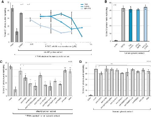 Figure 5. Inhibition of xNuRD Leads to an Inhibition of Y RNA-Independent DNA ReplicationShown is inhibition of DNA replication using HDAC inhibitors and NuRD-specific antibodies.(A) Template nuclei were incubated in Y RNA-depleted human cytosolic extract supplemented with partially purified xNuRD and the indicated concentrations of the HDAC inhibitors trichostatin A (TSA), SAHA, and MS-275.(B) Template nuclei were incubated with human cytosolic extract containing human NuRD and Y RNAs in the presence of the indicated inhibitors.(C) Template nuclei were incubated in Y RNA-depleted human cytosolic extract supplemented with partially purified xNuRD and the indicated NuRD-specific antibodies.(D) Template nuclei were incubated with human cytosolic extract containing human NuRD and Y RNAs in the presence of the indicated NuRD-specific antibodies. Mean values ± SD of the percentages of replicating template nuclei are plotted from n independent experiments. Results of t tests (unpaired, two-tailed with unequal variance) of treated experimental samples against the no addition controls are indicated (∗∗p ≤ 0.01; ∗∗∗p ≤ 0.001). |