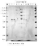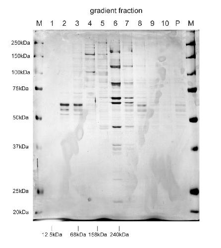 Figure S1. Polypeptide composition of the Y RNA-independent initiation factor from Xenopus egg extracts. Related to Figure 2. Protein composition analysis of final sucrose minigradient fractions by SDS-PAGE and silver staining. Fraction numbers (1-10, collected from top to bottom of the gradient), pellet (P) and molecular weight markers (M) are indicated. Sedimentation positions of calibrator protein complexes (cytochrome C, 12.5kDa; bovine serum albumin, 68kDa; aldolase, 158kDa; catalase, 240kDa) are indicated at the bottom. |