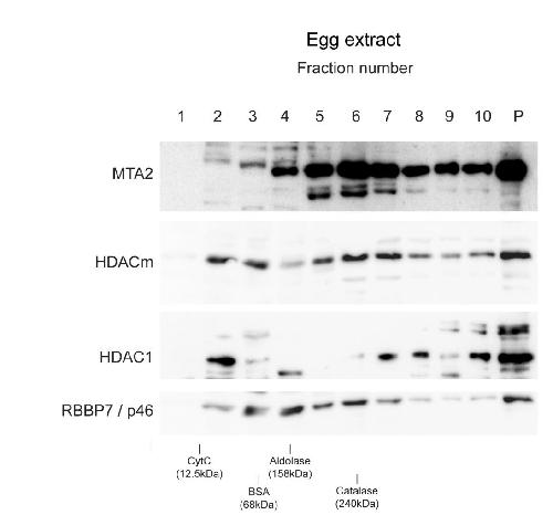 Figure S4. Complex formation of xNuRD in Xenopus egg extracts. Related to Figure 6. xNuRD was partially purified by precipitation of egg extract with 20-45% ammonium sulphate and ultracentrifugation through preparative sucrose gradients. MTA2, HDACm, HDAC1 and RBBP7/p46 subunits were analysed by Western blot analysis of the preparative sucrose gradient fractions. Fraction numbers (1-10, collected from top to bottom of the gradient), the pellet fraction (P), and positions of sedimentation markers are indicated. |