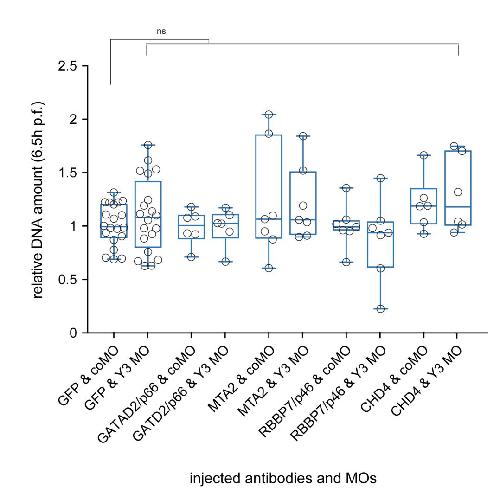 Figure S6. Embryonic DNA synthesis after microinjection with ineffective antibodies. Related to Figure 7. Antibodies directed against control GFP and the indicated subunits of xNuRD (5ng/embryo) were (co)injected with the indicated MOs (40 ng/embryo of coMO or xY3MO; Collart et al., 2011) into the animal pole at the 1 cell stage. Total embryonic DNA of the experimental repeats was quantified relative to rRNA. Individual data sets were normalised to the mean of the control anti-GFP distributions, and plotted as box and whisker plots superimposed with individual data points. Results of T-tests (unpaired, two-tailed with unequal variance) of treated experimental samples against the controls are indicated (ns, not significant). |
