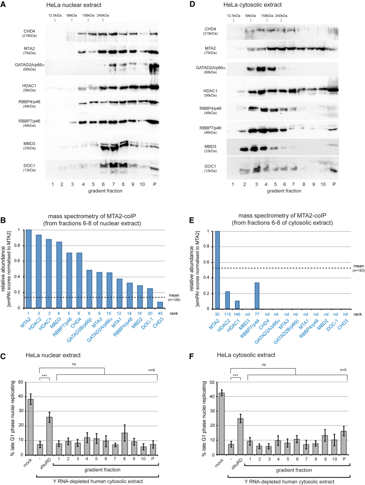 Figure 4. Human NuRD Complexes Are Structurally and Functionally Distinct from xNuRD(A–F) Proliferating human HeLa cells were fractionated into nuclear (A–C) and cytosolic extracts (D–F), and each extract was partially sub-fractionated by precipitation with 20%–45% ammonium sulfate and ultracentrifugation through preparative sucrose gradients.(A and D) Western blot analyses of human NuRD subunits. Fractions of the preparative sucrose gradients of nuclear (A) and cytosolic extracts (D) were analyzed by western blotting with antibodies specific for the indicated human NuRD subunits.(B and E) Mass spectrometry analysis of the MTA2 co-immunoprecipitations. Fractions 6–8 of the preparative sucrose gradients of nuclear (B) and cytosolic extracts (E) were pooled, and human NuRD was immunoprecipitated with anti-MTA2 antibodies. Human proteins identified in the immunoprecipitates (n = 126 and n = 183 for nuclear and cytosolic extracts, respectively) were ranked according to their quantitative emPAI values after normalization to emPAI (MTA2) = 1, and all human NuRD subunits detected are plotted with their rank. The mean normalized emPAI values of all proteins are indicated by dashed lines.(C and F) Activity profiles of the sucrose fractions. Template nuclei were incubated in Y RNA-depleted human cytosolic extract supplemented with the indicated gradient fractions of the nuclear (C) and cytosolic extracts (F). Mean values ± SD of percentages of replicating template nuclei are plotted of n independent experiments. Brackets indicate results of t tests (unpaired, two-tailed with unequal variance) of the positive control (xNuRD) and experimental samples against the Y RNA-depleted background (∗∗∗p ≤ 0.001).See also Figures S2 and S3 and Table S3. |