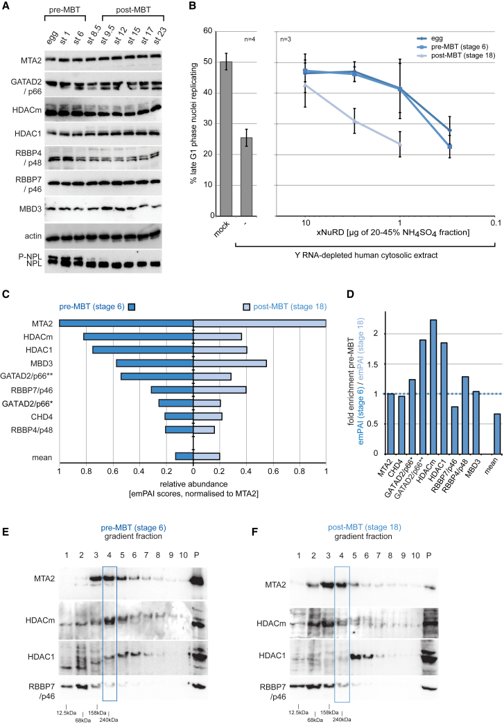 Figure 6. The Replication Initiation Activity and Complex Formation of xNuRD Declines after MBT(A) Expression of xNuRD during development of Xenopus laevis. Extracts of staged embryos were analyzed by western blotting. Pre-MBT and post-MBT stages are indicated. Dephosphorylation of hyperphosphorylated nucleoplasmin (P-NPL) is a control for MBT (stage 8.5).(B) DNA replication initiation activity of xNuRD declines after MBT. Template nuclei were incubated in Y RNA-depleted human cytosolic extract supplemented with partially purified xNuRD from activated eggs, stage 6 pre-MBT embryos, and stage 18 post-MBT embryos, as indicated. Mean values ± SD of the percentages of replicating template nuclei are plotted from n independent experiments.(C) Mass spectrometry analyses of xNuRD complexes. MTA2 was immunoprecipitated from pre-MBT (stage 6) and post-MBT (stage 18) embryo extracts. Xenopus proteins identified in the immunoprecipitates were ranked according to their quantitative emPAI values in the pre-MBT IP after normalization to emPAI (MTA2) = 1. All xNuRD-specific subunits detected are plotted (left, dark blue bars for pre-MBT; right, light blue bars for post-MBT). The mean normalized emPAI values for all detected proteins are indicated. Separate isoforms were identified in the Uniprot database for GATAD2/p66 (∗LOC398154; ∗∗LOC100158394, isoform X2).(D) Relative enrichment of xNuRD subunits before MBT in immunoprecipitated complexes. Normalized emPAI values were taken from MTA2 co-immunoprecipitations of stage 6 pre-MBT and stage 18 post-MBT extracts, and their ratios are plotted for the indicated xNuRD subunits and the overall mean.(E and F) xNuRD complex formation in (E) pre-MBT and (F) post-MBT embryo extracts. xNuRD was partially sub-fractionated by precipitation with 20%–45% ammonium sulfate and ultracentrifugation through preparative sucrose gradients. MTA2, HDAC, and RBBP7 subunits were analyzed by western blot analysis of the preparative sucrose gradient fractions. A blue box shows the reference for the sedimentation of active xNuRD from egg extracts. Positions of sedimentation markers are indicated.See also Figure S4 and Table S4. |