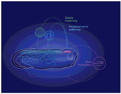 Figure 1. The processes of embryogenesis instructing patterning form a closed-loop control system between the brain and the body. A schematic drawing of a developing Xenopus embryo, representing how the embryonic brain (purple) is receiving instructive inputs from different (distal and proximal) body tissues to help building the right brain parameters (for example, shape and size). We have recently shown that this control operating system is bi-directional. The very early brain itself has, in turn, an instructive role on morphogenesis and patterning of remote tissues, such as peripheral neural network (blue) and somitic myotome (green). This closed-loop between brain and body is the earliest example of scaling and effective communication for self-assembly of complex biological structures