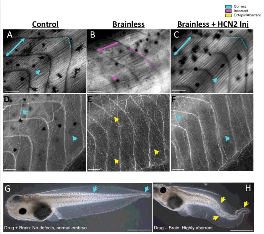 Figure 2. Functions of the very early brain include guiding and protecting correct embryo morphogenesis, which can be mimicked by ectopic expression of ion channels. Comparative images of muscle (A-C, under polarized light) and nerve (D-F, revealed by immunofluorescence against acetylated-alpha tubulin) structures of embryos that developed with a brain (Control), embryos that developed without a brain (Brainless), and embryos that developed without a brain and were injected with messenger RNA encoding the HCN2 ion channel (Brainless + HCN2 Inj). The absence of a brain during development leads to abnormal development of the muscles and the peripheral nerves, at considerable distances from the head, with disorganization of the body plan, myotomes lacking proper angles (magenta-dashed line in B), alterations in somite length (represented by two-headed arrows) and ectopic growth of nerve tissue (yellow arrows in E). By manipulating bioelectricity, for example via the mis-expression of HCN2, rescues the devastating muscle and nerve mispatterning that occurs in brainless animals (turquoise arrows in C, F). Rostral is right and dorsal is up. Scale bar = 100 μm. G, H. The effects of the drug (RS)-(tetrazol-5-yl)glycine during development depends on the presence or absence of the nascent brain in the embryo. While exposure to this drug does not cause developmental defects in control embryos (turquoise arrows in G indicate correct tail phenotype), it leads to severe deformities (yellow arrows in H demarcate bent spinal cord and tail aberrations) when the brain is not present to protect. Rostral is left and dorsal is up. Scale bar = 1 mm.