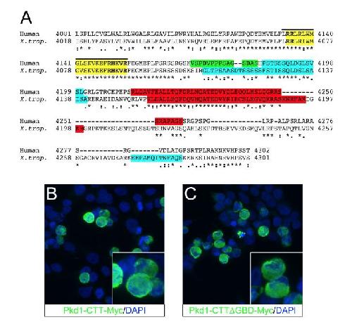 transfected with Pkd1-CTT-Myc (B) or Pkd1-CTTΔGBD-Myc (C). Nuclei were counterstained