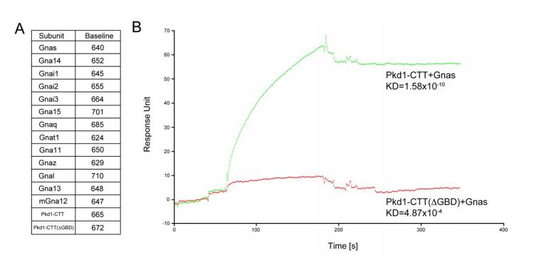 showing the strong interaction of Gnas with a GST-Pkd1-CTT fusion protein, but not with the