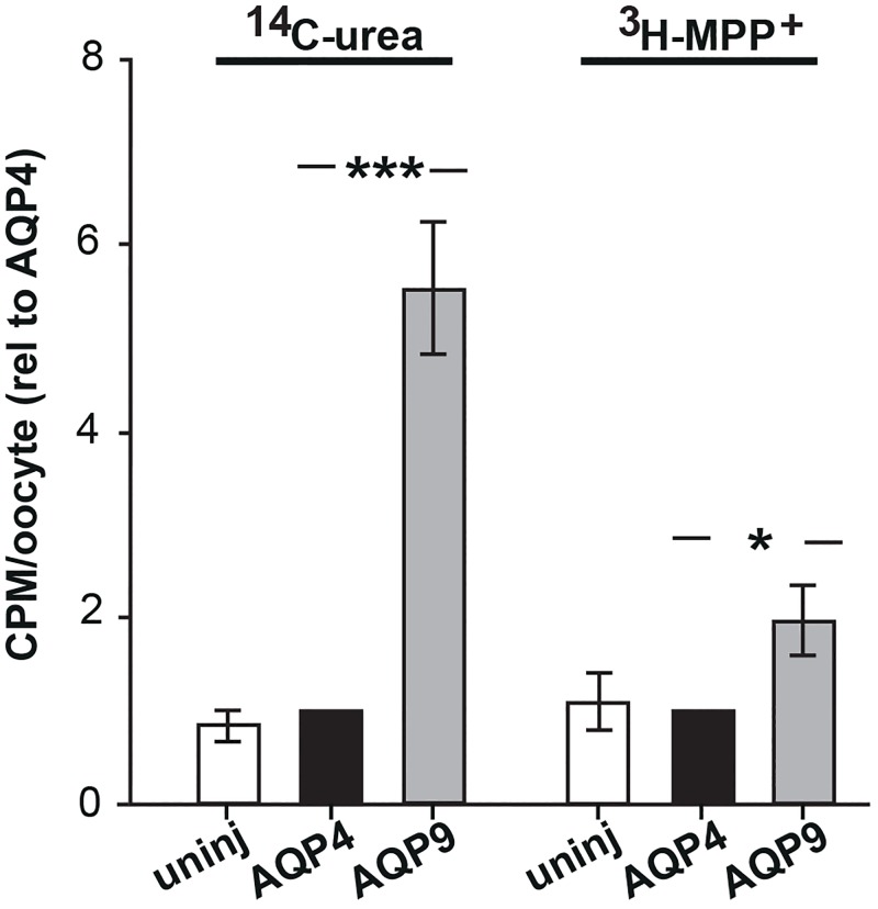 Fig 1. Xenopus oocytes expressing AQP9 reveal higher uptake of MPP+.Xenopus oocytes expressing AQP4 or AQP9 and uninjected oocytes were exposed to 14[C]urea or 3[H]MPP+. Data were obtained as counts per minute (CPM)/oocyte and averaged for each construct. The uptake was normalized to that of the AQP4-expressing oocytes prior to averaging across the n = 7 experiments with five to ten oocytes included for each experimental condition. Compared with uninjected oocytes and AQP4 expressing oocytes, oocytes expressing AQP9 accumulate significantly higher amounts of urea as well as MPP+. Bars are mean ± SEM; *p<0.05, ***; p<0.001. |