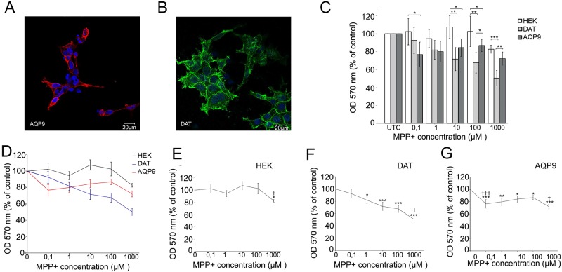 Fig 2. HEK293 cells expressing hAQP9 or hDAT reveal higher sensitivity to MPP+.A-B) Immunofluorescence images of HEK293 cells expressing EGFP-hAQP9 (A) or YFP-hDAT (B) grown on coverslips confirm plasma membrane localization of the respective constructs (identified by antibodies to AQP9 or DAT). The cells were counterstained with Hoechst to visualize nuclei. C-G) Native HEK293 cells and HEK293 cells expressing EGFP-hAQP9 or YFP-hDAT were grown in 96-well plates and exposed to different concentrations of MPP+ (four wells for each concentration). Cell viability was assessed after 24 hours using the MTT assay. Data were collected from independent plates (n = 3 for each construct) and normalized to respective untreated cells. Native HEK293 cells show sensitivity to MPP+ only at very high concentrations (~100 μM). Cells expressing hDAT become sensitive at 1 μM MPP+, compared with 0.1 μM for cells expressing hAQP9. Overlay of the dose/response curve for the three groups (D) and the individual curves for native HEK293 cells (E), YFP-hDAT expressing (F) and EGFP-hAQP9 expressing HEK293 cells (G) are shown. Bars are mean ± SEM. Asterisks: significantly different from untreated controls; *p<0.05, **p<0.01, ***p<0.001; crosses: significantly different from previous data point: ++<0.01. |