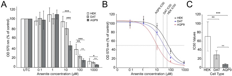 Fig 3. HEK293 cells expressing EGFP-hAQP9 are more sensitive to arsenite than HEK293 cells expressing YFP-hDAT.A-C) Native HEK293 cells and HEK293 cells expressing EGFP-hAQP9 or YFP-hDAT were grown in 96-well plates and exposed to different concentrations of arsenite (eight wells for each concentration). Cell viability was assessed after 24 hours using the MTT assay. Data were collected from independent plates (n = 3 for each construct) and normalized to respective untreated cells. Both EGFP-hAQP9 and YFP-hDAT expressing cells showed higher sensitivity to arsenite, than native HEK293 cells, with EGFP-hAQP9 cells being the most sensitive. At the arsenite concentration of 10 μM, stably transfected EGFP-hAQP9 were the only cells showing toxin sensitivity (A). The curve showing IC50 values for arsenite calculated by nonlinear regression, log(inhibitor) vs response (three parameters) is shown (B). For log transformed data, the concentration 0 was set to 1 nM. Comparison of the IC50 values shows a significantly lower IC50 value for the HEK293 cells expressing EGFP-hAQP9 compared to the native HEK293 cells or HEK293 cells expressing YFP-hDAT (C). Bars are mean ± SEM. Asterisks: significantly different from untreated controls; *p<0.05, **p<0.01, ***p<0.001; crosses: significantly different from previous data point: ++ p<0.01. |