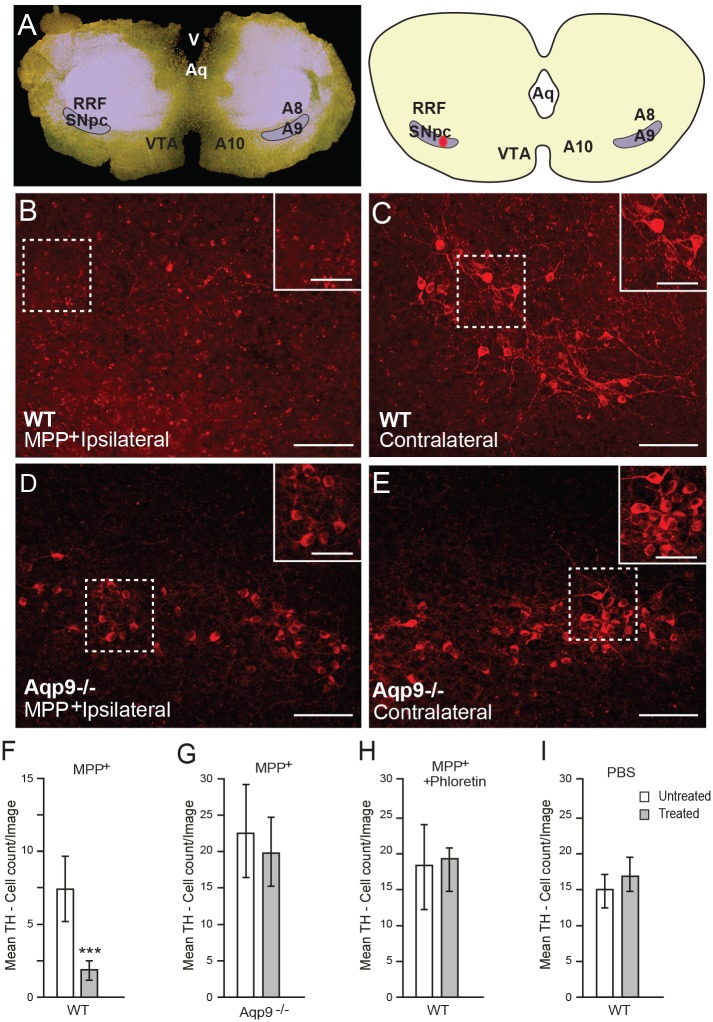 Fig 4. Deletion of Aqp9 protects against MPP+ toxicity in vitro.A) Photomicrograph (left) and schematic representation (right) of a representative midbrain slice. Site of MPP+ application is indicated in red. B-E) Immunofluorescence staining of representative midbrain slices from WT (B, C) and Aqp9-/- mice (D, E) showing TH-positive neurons in the MPP+ treated side (ipsilateral; B, D), and in the control side (contralateral, C, E). Note the extensive loss of ipsilateral TH-positive neurons in the WT slice (B). F-H) Quantitative analyses of the TH-positive cell count in slices treated with 30 μM MPP+ (F, G) show significant loss of TH-positive neurons in the ipsilateral hemisphere of the WT slice (n = 8) (F). No significant difference was observed between the ipsi- and contralateral hemisphere of Aqp9-/- slices treated with 30 μM MPP+ (n = 7) (G), WT slices treated with a combination of 60 μM MPP+ and 100 μM phloretine (n = 11) (H), or WT slices treated with saline (n = 8) (G). In WT mice, the TH-positive cell count contralateral to MPP+ application (F) was lower than the TH-positive cell count in saline treated slices (H), suggesting spillover of MPP+ from the ipsilateral side. RRF: retrorubral field; Aq: aqueduct; V: ventricle; A9: population of dopaminergic neurons. Bars are mean ± SEM; ***p<0.001. Scale bar: 100 μm; scale bar inset: 50 μm. |