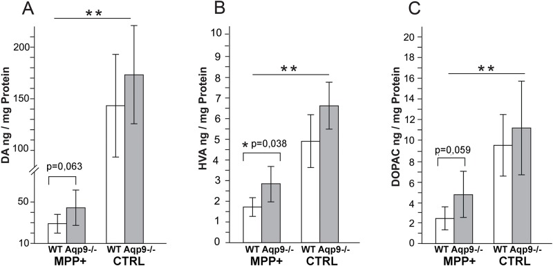 Fig 7. HPLC analysis of dopamine and its metabolites.A-C) After unilateral injections of MPP+ in the striatum, the ipsilateral striatum shows a significant reduction in the concentration of DA (A), HVA (B) and DOPAC (C) compared to the contralateral hemisphere (Aqp9-/-, n = 6; WT, n = 6). The ipsilateral reduction in HVA is significantly more pronounced in WT mice than in Aqp9-/- mice (p = 0.038). Corresponding p-values for DA and DOPAC are 0.063 and 0.059, respectively. Bars are mean ± 2 SEM; *p<0.05, ** p<0.01, ***p<0.001. |