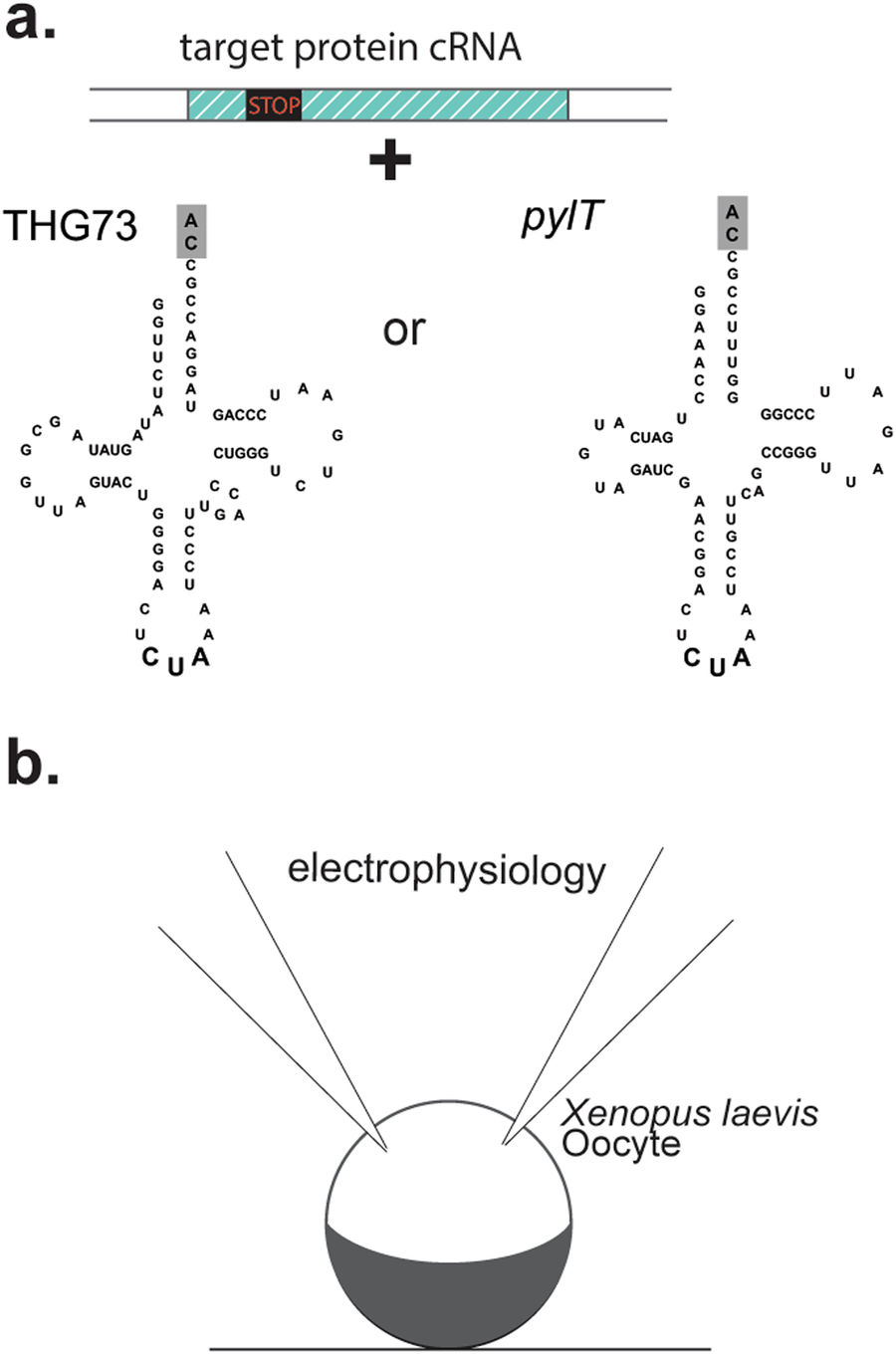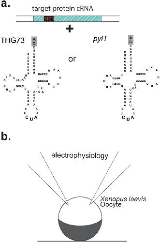 Figure 1. Misacylation of orthogonal tRNA for genetic code expansion. (a) Target protein cRNA containing a site-directed stop codon (nonsense codon) is subsequently suppressed by an orthogonal tRNA - THG73 or pyrrolysine tRNA (pylT). The grey highlighted nucleotides âCAâ represent ligated pdCpA (see methods). (b) Co-injection of tRNA and cRNA into the Xenopus oocyte enables electrophysiological two-electrode voltage clamp characterization of ion channels and receptors containing ncAA.