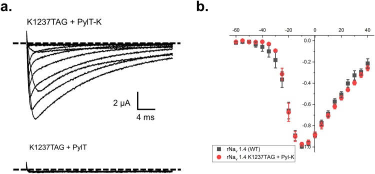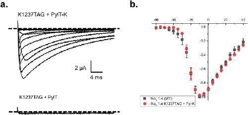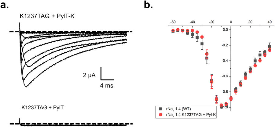 Figure 4. pylT enables the faithful encoding of lysine into position K1237 of rNav 1.4. (a) Example traces of rNav 1.4-K1237TAG cRNA coinjected with either lysine-acylated (top) or unacylated full length (bottom) PylT. Oocytes were held at −100 mV and pulsed from −80 mV to +40 mV with 30 ms depolarizing steps. Voltage gated sodium channel activity is evidenced by increasingly large downward deflections in the traces in response to depolarization. The level of zero current for each cell is indicated by a dashed line. (b) Normalized current-voltage relationship plots comparing the WT rNav 1.4 channel to that of the rNav 1.4 K1237TAG rescued with lysine.