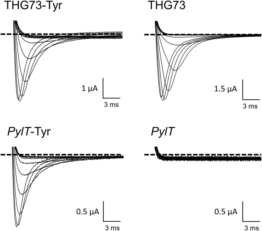 Figure 2. Rescue of an introduced stop codon into the human cardiac voltage gated sodium channel. Voltage-induced currents upon co-injection of hNav 1.5 S571TAG with either acylated (left) or unacylated tRNA (right) variants THG73 (top) or pylT (bottom). Xenopus oocytes expressing sodium channel variants were subjected to membrane depolarizations (steps from â80 mV to â20 mV). Traces show development of rapidly inactivating sodium currents as downward deflections. The level of zero current for each cell is indicated by a black dashed line.