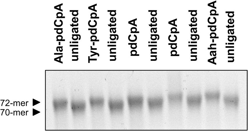 Figure 3. pylT can be efficiently ligated to dinucleotide-amino acid substrates in vitro. TBE UREA tRNA gels show successful ligation of substrates to pylT. Approximately 2âµg of tRNA was run per well. Each lane represents an independent ligation. Note the consistent gel shift representative of ligation of the dinucleotide-amino acid substrate to the truncated pylT. Abbreviations: Ala (alanine), Tyr (tyrosine), Aah (alpha-hydroxy alanine). Examples of additional substrate types are available in the Supplementary Figures.