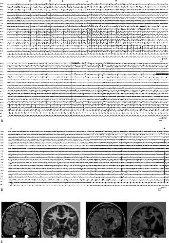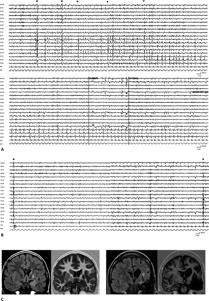 Figure 1. (A) EEG recording performed before the introduction of cannabis: the tracing shows a subcontinuous paroxysmal epileptiform activity characterized by discharges of spikes in the left hemisphere with rapid contralateral transmission, followed by a brief voltage attenuation on the left frontocentral and anterior temporal regions, and then by a pseudoperiodic slow spikeâandâwave activity propagating over the midposterior temporal areas. The clinical correlate consisted of a seizure characterized by intense right perioral myoclonus (*), followed by ipsilateral tonic deviation of the mouth (â), dystonic posturing of the right limbs (â¦), and partial consciousness impairment ().The neurological examination showed severe ideomotor slowing and an evident worsening of the preexistent aphasia, with increased difficulty in verbal comprehension and word reaching. (B) EEG recording performed 1 year after the introduction of cannabis: the tracing shows diffuse discharges of spikes, clinically associated with isolated perioral myoclonus (*), and focal thetaâdelta activity intermingled with spikes and spikeâandâwaves located on the frontal and anterior and middle temporal regions. An improvement in cognitive and, more specifically, language functions was observed. (C) MRI scan (FLAIR and IR sequences). On the left: MRI scan before surgery, showing the presence of a lesion involving the left insula with concomitant slight hyperintensity and bulging of the mesial temporal area and atrophy of the head of the ipsilateral caudate nucleus. On the right: MRI scan after left temporal lobectomy, showing diffuse white matter alterations and leftlateralventricle dilatation.