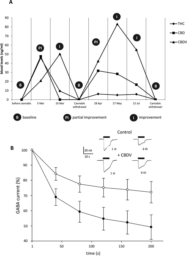 Figure 2. (A) Cannabinoids serum levels and electroclinical correlations. B: baseline, defined as the coexistence of subcontinuous motor seizures (right perioral myoclonus, ipsilateral tonic deviation of the mouth, dystonic posturing of the right limbs, and partial consciousness impairment) and severe ideomotor slowing with mixed aphasia; PI: partial improvement, defined as the coexistence of perioral myoclonia, subclinical ictal discharges, and motor aphasia; I: improvement, defined as the persistence of isolated perioral myoclonic jerks and the improvement of language fluency. Plasma concentrations of Î9âtetrahydrocannabinol (THC), cannabidiol (CBD), and cannabidivarin (CBDV) were quantified by liquid chromatography tandem mass spectrometry (LCâMS/MS) according to Ferreiròs et al. with slight modifications. After solid phase extraction (SPE), chromatography was performed on KInetex C18 column (50 à 2.1 mm, 2.6 particle size) with a gradient of 0.01% formic acid in water and 0.01% formic acid in methanol. THC and CBDV were monitored using positive mode electrospray ionization and multiple reaction monitoring (MRM). The transitions were m/z 315 â 193 and 287.2 â 165.2 for THC and CBDV, respectively. The limit of quantification (LOQ) was 0.5 ng/ml for both analyses. (B) Normalized timeâcourse of the averaged (mean ± SEM) GABA current rundown in oocytes transplanted with hippocampal membranes in control condition (filled symbol) and after 50 nm