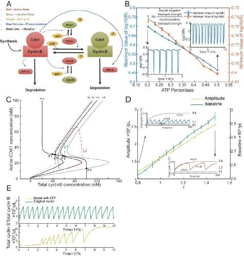 (A) Schematic view of the cyclin B-Cdk1 oscillation system. Note that ATP is taken into consideration. Activated molecules are marked in red, inactivated molecules in green and ATP or Pi in yellow. Black line indicates a reaction and blue dotted line a phosphorylation. (B) Relationship between ATP percentage and R value, showing that decreasing the ATP concentration leads to a higher R value. Error bars represent ranges from three simulations. Two inserts represent the dynamics of R value over time when the ATP percentage [ATP]/([ATP]+[ADP]) is set as 0.2 (left) and 0.5 (right). The model is simulated using Gillespie algorithm. (C) Phase plots of the two-ODE model. Parameters for the cyclin B nullcline (Ncyc) (Yang and Ferrell, 2013) and the Cdk1 nullclines with a variety of values of r (N1, r = 0.5; N2, r = 0.8; N3, r = 1.5; N4, r = 2.5) were chosen based on previous experimental work (Pomerening et al., 2003; Sha et al., 2003). Note that the r here is a parameter and is different from R in Figure 3B. Two sample traces of limit cycle oscillations are plotted for r = 0.8 (L1) and r = 1.5 (L2), showing that a larger r value leads to a higher amplitude and baseline. In addition, r = 0.5 (N1) generates a low stable steady-state of cyclin B (P1), while r = 2.5 (N4) a high stable steady-state of cyclin B (P4). These stable steady-states are indicated by the intersections of the nullclines (filled circles). The unstable steady states are labeled with open circles (P2 and P3). (D) Relationship between the oscillation baseline and amplitude values and ATP concentration (positively correlated with r). Error bars indicate the ranges of 3 replicates. Inserts show two example time courses of total cyclin B with different r values (L1, r = 0.8; L2, r = 1.5), colors of which match the ones in Figure 3C. Simulation is done using Gillespie algorithm. (E) Time series of total cyclin B molecules from the model without ATP (top panel, green line) and with ATP (bottom panel, yellow line). |