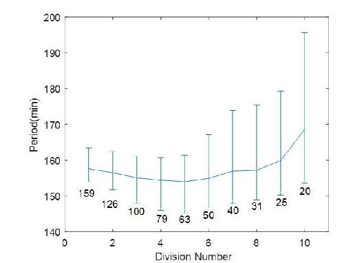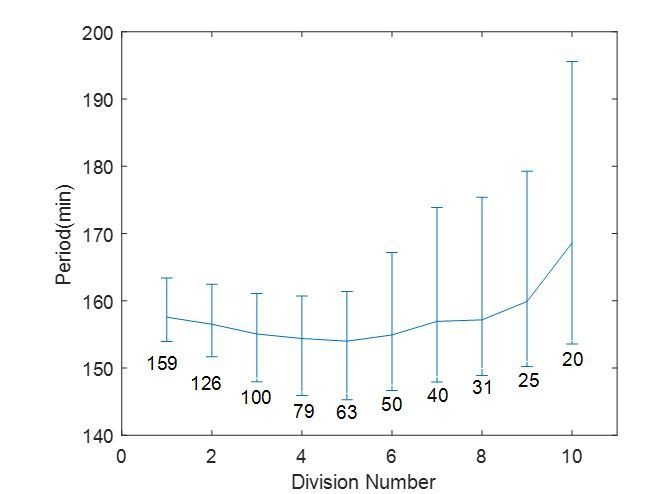 Author response image 2. A thought experiment of a droplet of 200 µm in diameter undergoing ten divisions.The cell cycle period is calculated for each division, with each corresponding diameter labeled on the figure. The error bar is showing 25th and 75th percentile as in Figure 2F in the main text. |