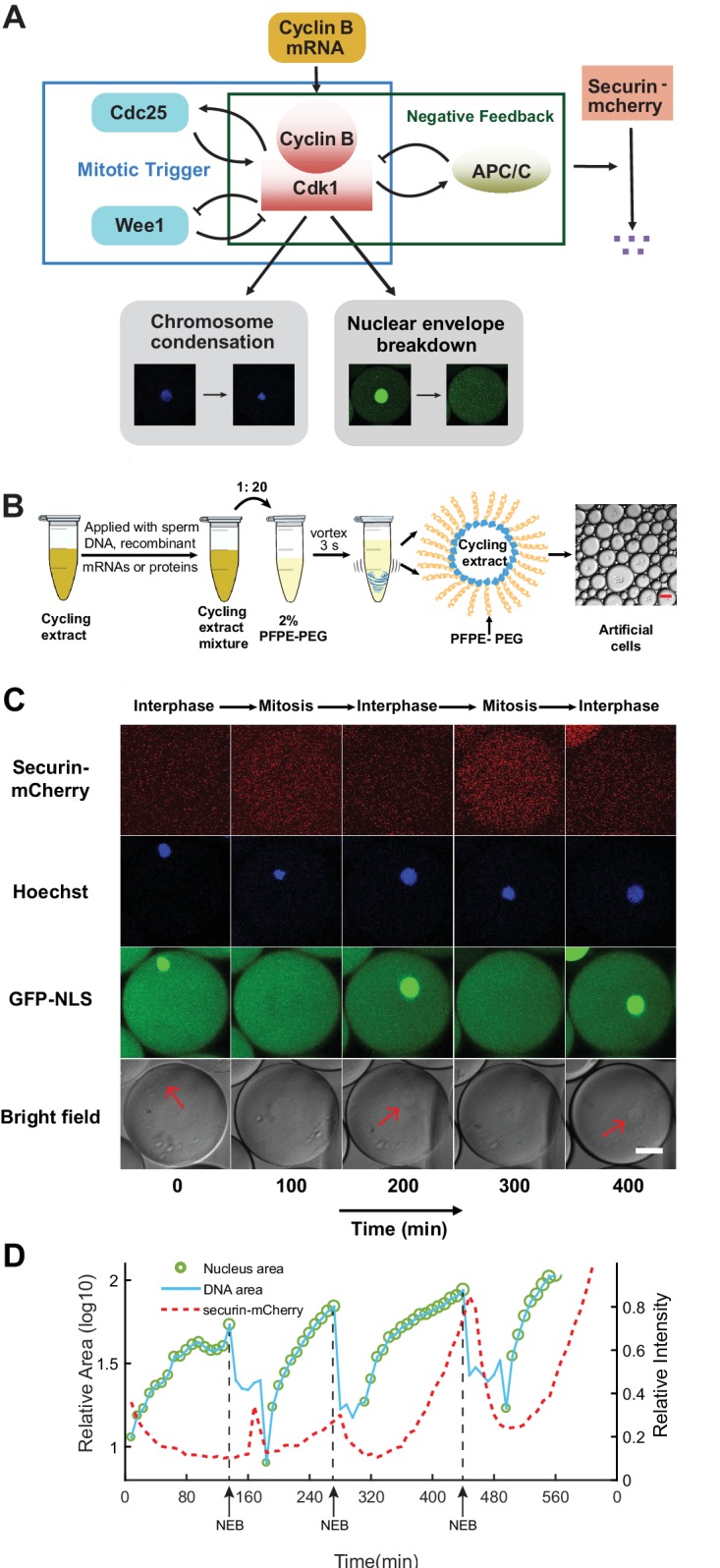 (A) Schematic view of a cell cycle oscillator that consists of coupled positive and negative feedback loops. The central regulator, cyclin B-Cdk1 complex activates its own activator, phosphatase Cdc25, forming a positive feedback loop, and inhibits its own inhibitor, kinase Wee1, forming a double negative feedback loop. Additionally, cyclinB-Cdk1 activates the E3 ubiquitin ligase APC/C, which targets cyclin B for degradation and completes a core negative feedback loop. Active APC/C also promotes the degradation of another substrate securin. Once cyclinB1-Cdk1 complex is activated, the circuit drives a set of mitotic events including chromosome condensation and nuclear envelope breakdown (NEB). (B) Experimental procedures. Cycling Xenopus extracts are supplemented with various combinations of recombinant proteins, mRNAs, and de-membraned sperm DNAs, which are encapsulated in 2% Perfluoropolyether-poly (ethylene glycol) (PFPE-PEG) oil microemulsions. Scale bar is 100 µm. (C) Snapshots of a droplet were taken periodically both in fluorescence channels (top three rows) and bright-field (the last row). The cyclic progression of the cell cycle clock and its downstream mitotic processes are simultaneously tracked by multiple fluorescence reporters. The clock regulator APC/C activity is reported by its substrate securin-mCherry, chromosomal morphology changes by the Hoechst stains, and NEB by GFP-NLS. Nuclear envelopes (red arrows) are also detectable on bright field images, matching the localization of GFP-NLS indicated nuclei. Scale bar is 30 µm. (D) Multi-channel measurements for the droplet in Figure 1C. The nucleus area (green circle) is calculated from the area of the nuclear envelope indicated by GFP-NLS, noting that the areas of the green circles are also scaled with the real areas calculated for the nuclei. DNA area curve (blue line) shows the chromosome area identified by Hoechst 33342 dye. Chromosome condensation happens almost at the same time as the nuclear envelope breaks down (black dashed line). The red dashed line represents the intensity of securin-mCherry over time, suggesting that degradation of the APC/C substrate lags behind NEB consistently at each cycle. |