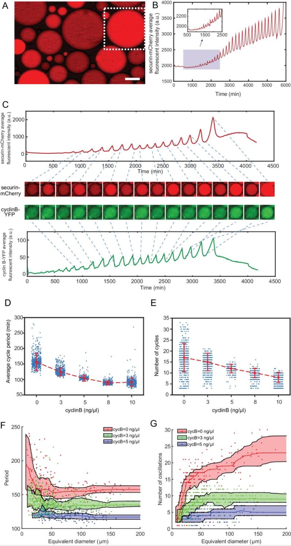 (A) Fluorescence image of securin-mCherry, a reporter for the cell cycle oscillator, in micro-emulsion droplets (scale bar, 100 µm). One example droplet (inside the white dotted framed square) is selected for time course analysis in Figure 2B. (B) The time course of securin-mCherry fluorescence intensity of the selected droplet from Figure 2A, indicating 32 undamped oscillations over a course of 100 hr. (C) Simultaneous measurements of fluorescence intensities of securin-mCherry (upper panel) and cyclin B-YFP (lower panel), showing sustained oscillations for about 58 hr. The mRNA concentrations of securin-mCherry and cyclin B-YFP are 10 ng/µL and 1 ng/µL. The series of mCherry and YFP images correspond to selected peaks and troughs in the time courses of fluorescence intensities. The two channels have coincident peaks and troughs for all cycles, suggesting that they both are reliable reporters for the cell cycle oscillator. (D, E) The oscillator is tunable in frequency (D) and number of cycles (E) as a function of the concentration of cyclin B mRNAs. Cyclin B not only functions as a substrate of APC/C but also binds to Cdk1 for its activation, functioning as an ‘input’ of the clock. In Figure 2D, the cell cycle periods are shortened by increasing the mRNA concentrations. In Figure 2E, the number of total cell cycles is reduced in response to increasing cyclin B mRNA concentrations. Each data point represents a single droplet that was collected from one of the loading replicates (see Materials and methods 7). Red dashed line connects medians at different conditions. Error bar indicates median absolute deviation (MAD). (F, G) Droplets with smaller diameters have larger periods on average and a wider distribution of periods (F), and exhibit smaller number of oscillations on average (G). Colored areas represent moving 25 percentiles to 75 percentiles and is smoothed using the LOWESS smoothing method (see Materials and methods 7). The equivalent diameter is defined as the diameter of a sphere that has an equal volume to that of a droplet, estimated by a volume formula in literature (Good et al., 2013). Note that these size effects are smaller for droplets with higher cyclin B mRNA concentrations. |
