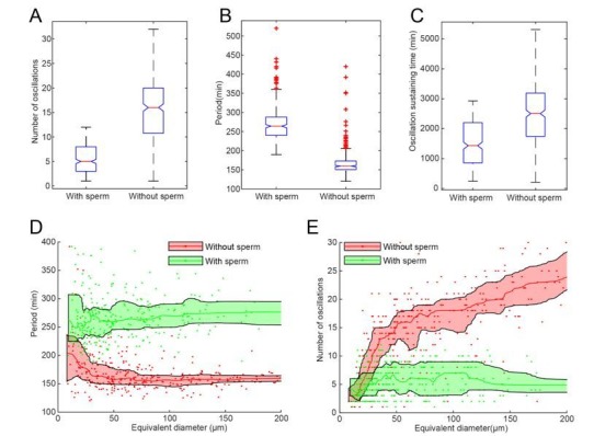 Author response image 1. A-C Statistics of droplets with sperm DNA (N=320) and without sperm DNA (N=373).All droplets were prepared in the same day from the same batch of frog eggs. The figures show that adding sperm DNA may cause significant difference in number of oscillations (A), period (B) and oscillation sustaining time (C). D-E. Droplet-size dependence of period (D) and number of oscillations (E) with nucleus effect, showing that adding sperm DNAs has a more significant impact on larger droplets. |