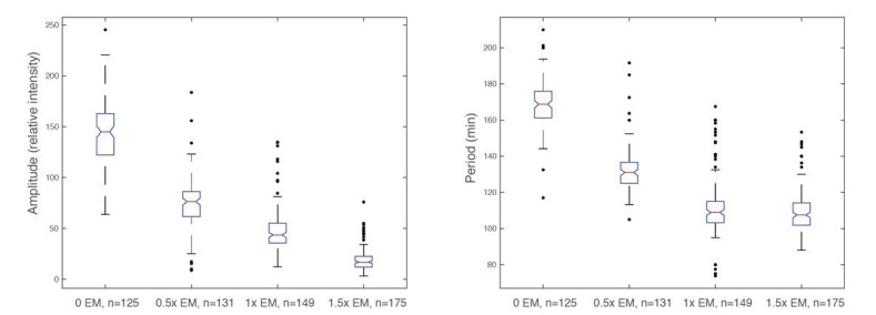 Author response image 6. Time traces of individual droplets with different concentrations of energy mix.Each condition has two duplicate experiments and only one is shown. It is evident that the amplitude, baseline, and period decrease as the level of energy mix increases. |