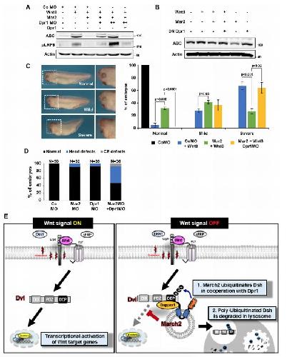 Fig. 7. March2 antagonizes canonical Wnt signaling in concert with Dapper1 for head formation. (A) Dpr1MO impairs the March2-mediated decrease of activated β-catenin and phosphorylated LRP6 levels. Amounts of injected mRNAs and MOs: Wnt8, 20 pg; March2, 1 ng; CoMO, 40 ng; Dpr1MO, 20 and 40 ng, respectively; Dpr1, 1 ng. (B) DN Dpr1 mRNA (2 ng) impedes the March2 mRNA (1 ng)-mediated decrease of activated β-catenin. (C) Rescuing ability of March2 mRNA (1 ng) for the Wnt8 DNA (40 pg)-mediated head defect was impeded by Dpr1MO (40 ng). âSevereâ denotes eyeless, malformation of cement glands and loss of anteriorhead structures. âMildâ denotes small sizes of eyes and head. Statistical analysis was carried out on three independent experiments. P values were obtained using two-tailed Studentâs t-test (see also Table S3). (D) Malfunction of endogenous March2 by moderate doses of Mar2MO (20 ng) and Dpr1MO (20 ng) induced head defects (see also Table S3). (E) Model for March2-mediated Dsh degradation in Xenopus. Upon Wnt stimulation, Dsh relays signal for downstream gene transcription. To maintain the Wnt-off state, reduction of the cytosolic pool of Dsh is required. For this purpose, March2 binds and ubiquitylates Dsh in concert with Dpr1 for lysosomal degradation.
