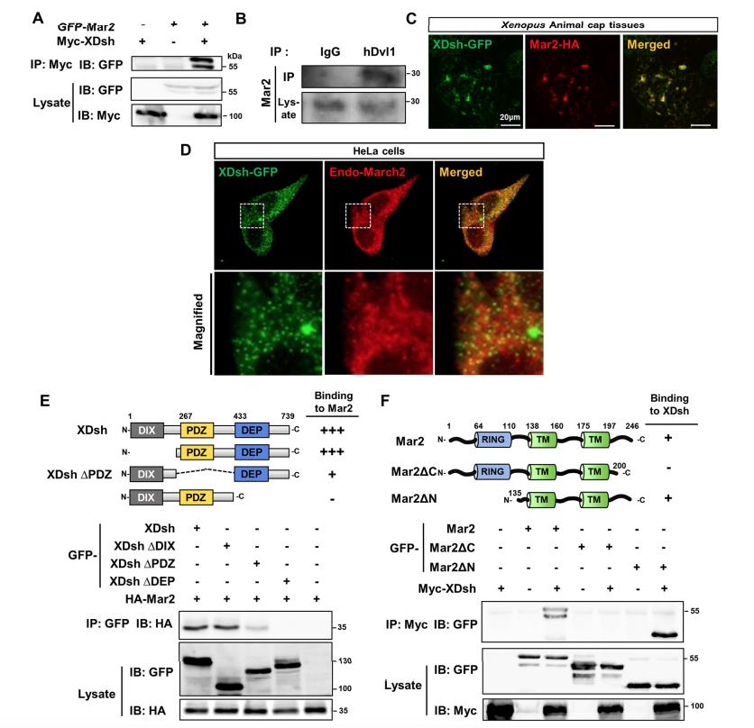 Fig. 1. Xenopus March2 interacts with Dsh. (A) Co-immunoprecipitation analysis with GFP-March2 and Myc-XDsh in HEK293FT cells. (B) Interaction of endogenous human Dvl1 with March2 in HEK293FT cells. Immunoprecipitation with anti-IgG antibody used as a negative control. (C) Xenopus animal caps injected with GFP-XDsh (500 pg) and HA-Mar2 (250 pg) mRNAs were immunostained and analyzed by confocal microscopy. (D) HeLa cells transfected with GFP-XDsh were stained with anti-GFP and anti-March2 antibody and analyzed by confocal microscopy. (E) Schematics of the various XDsh deletion mutants (top) used for co-immunoprecipitation analysis (bottom). Note that the PDZ and DEP domains of Dsh are required for the March2 interaction in HEK293FT cells. (F) Schematics of full-length March2, C-terminus-deleted and N-terminus-deleted mutant forms (top) and co-immunoprecipitation results (bottom) showing that the C-terminal region of March2 is important for the interaction with Dsh.