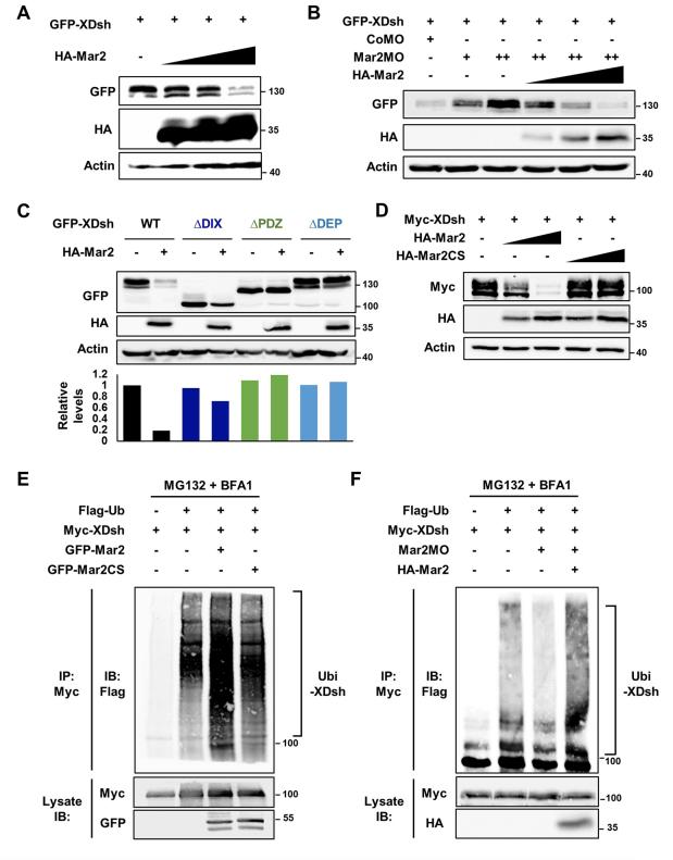 Fig. 2. Xenopus March2 induces the ubiquitylation-mediated degradation of Dsh. (A) March2 decreases Dsh protein in Xenopus. HA-Mar2 mRNA (250 pg, 500 pg, 1 ng) along with 200 pg of GFP-XDsh mRNA were injected and analyzed by western blotting at stage 10.5. (B) Mar2MO stabilizes Dsh protein. Mar2MO (40, 80 ng) was injected with 150 pg of GFP-XDsh mRNA. Co-injection of 250, 500 pg and 1 ng of March2 mRNA along with 80 ng of Mar2MO gradually reduced Dsh levels again. (C) DEP and PDZ domains of Dsh are required for March2 mediated Dsh degradation. All forms of GFPXDsh mRNA, 250 pg; HA-Mar2 mRNA, 1 ng. (D) March2CS cannot degrade Dsh. The amounts of mRNAs: Myc-XDsh, 250 pg; HAMar2 WT and CS, 500 pg and 1 ng, respectively. (E,F) In vivo ubiquitylation assays in Xenopus. Dsh protein was pulled down and poly-ubiquitylated Dsh protein was detected. The amounts of injected mRNAs: Flag-Ub, 2 ng; Myc-XDsh, 2 ng; GFP-Mar2 WT and CS, 1 ng; Mar2MO, 40 ng.
