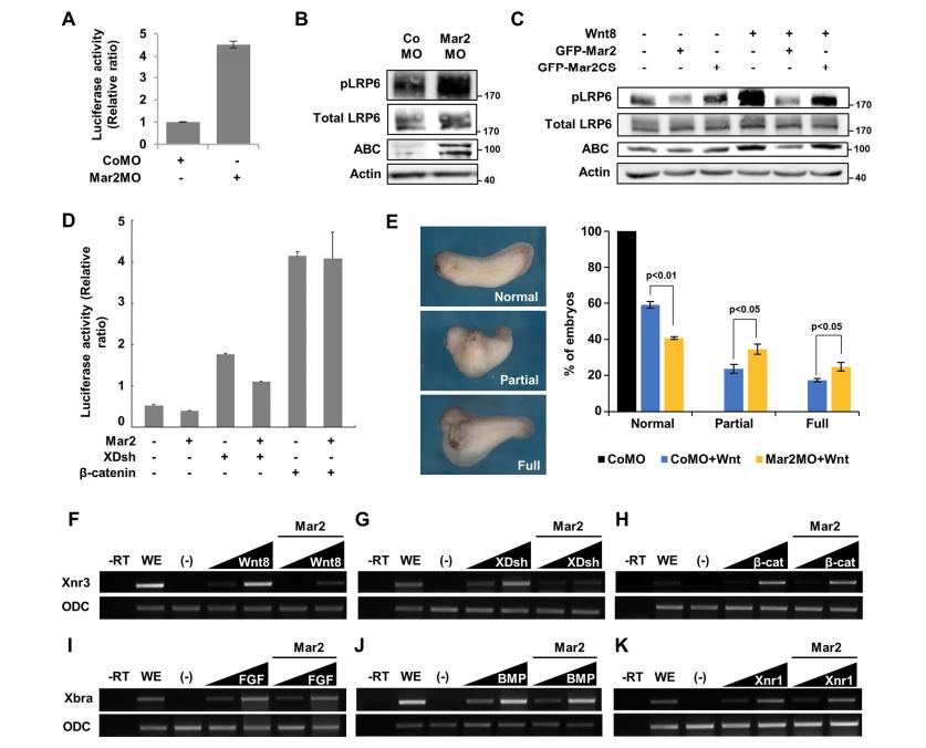 Fig. 4. March2 antagonizes canonical Wnt signaling in Xenopus. (A) Mar2MO (40 ng) increases TOPFlash activity in Xenopus. Error bars represent s.d. of triplicate experiments. P=0.0022. (B) Mar2MO mediates activation of β-catenin (ABC) and phosphorylation of LRP6. Four-cell stage embryos were dorsally injected with CoMO or Mar2MO (40 ng) and analyzed at stage 10.5. Actin and total LRP6: loading controls. (C) GFP-Mar2 mRNA (1 ng) expression but not GFPMar2CS mRNA (1 ng) decreases Wnt8 mRNA (20 pg)-mediated activation of β-catenin and phosphorylation of LRP6 in Xenopus. (D) Mar2 mRNA (1 ng) expression decreases TOPFlash activity induced by Dsh (2 ng) but not by β-catenin (200 pg). Error bars represent s.d. of triplicate experiments. (E) Mar2MO increases the severity of the Wnt8-induced ectopic axis. Wnt8 mRNA (1 pg) was injected with or without Mar2MO (50 ng) at the ventral side of the four-cell stage embryos and phenotypes were analyzed at the tadpole stage. âPartialâ indicates axis without head, including eyes and cement glands. âFullâ indicates axis with head. Statistical analysis was carried out on three independent experiments. Statistically significant differences between two sets are indicated. P values were obtained using two-tailed Studentâs t-test (see also Table S3). (F-H) RT-PCR analyses show that March2 inhibited Wnt8 or Dsh-induced Xnr3 expression in Xenopus animal caps (F,G) but did not inhibit β-catenin-induced Xnr3 expression (H). The amounts of injected mRNAs: Wnt8, 20 and 50 pg; XDsh, 1 and 2 ng; βcatenin, 50 and 100 pg; Mar2, 1 ng. (I-K) March2 did not inhibit FGF (I) and BMP (J); Nodal signals (K) mediated induction of Xbra expression. ODC serves as a loading control. -RT, control RT-PCR without reverse transcriptase; WE, whole embryos. Amounts of injected mRNAs: FGF, 50 and 150 pg; BMP, 50 and 200 pg; Xnr1, 100 and 200 pg; Mar2, 1 ng.
