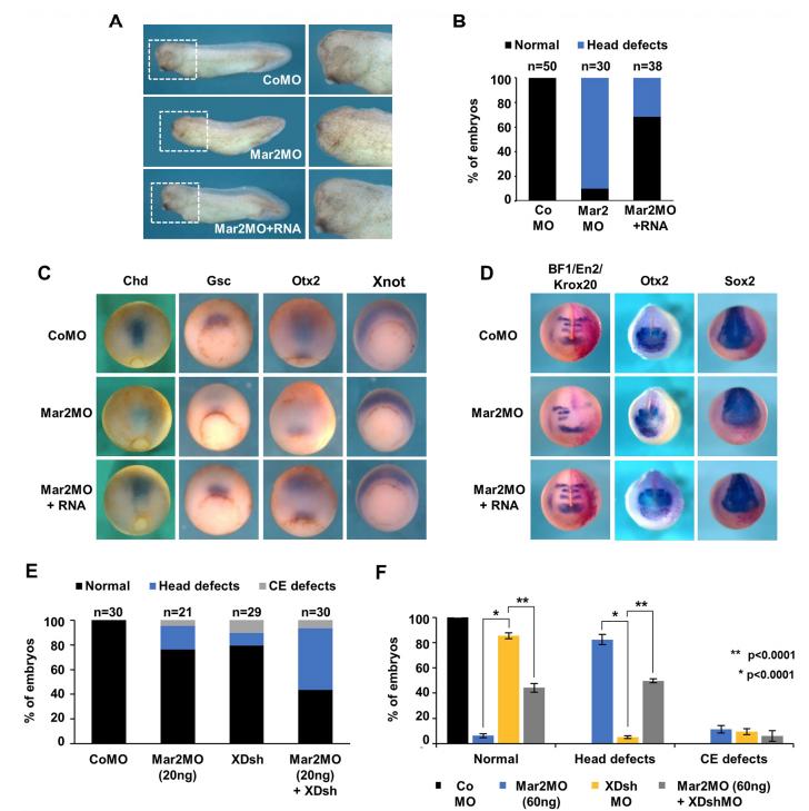 Fig. 5. March2 is required for anteriorhead formation in Xenopus. (A) Dorso-animal injection of Mar2MO (40 ng) at the eight-cell stage results in defects in anteriorhead formation; these defects were rescued by co-expression of a MO-resistant form of Xenopus March2 mRNA (500 pg). (B) Quantification of A. (C) In situ hybridization analysis showing that Mar2MO (40 ng) suppresses expression of Chd at stage 12, and Gsc and Otx2 at stage 11.5. Co-expression of March2 mRNA (500 pg) rescues the reduction of expression of these genes (see Fig. S5A). (D) Mar2MO suppresses expression of BF1, Otx2, En2 and Krox20 at stage 17. CoMO (40 ng) or Mar2MO (40 ng) along with β-galactosidase mRNA (100 pg) as a lineage tracer were injected into one dorso-animal blastomere of eight-cell stage embryos. The right side of the embryos shown have been injected with indicated reagents (see Fig. S5B). (E,F) March2 regulates head formation through Dsh. Two dorsoanimal blastomeres of eight-cell stage embryos were injected with indicated reagents, and phenotypes were analyzed at tadpole stages. (E) Mar2MO (20 ng) along with Dsh mRNA (250 pg) synergistically induced head defects. (F) Head defects caused by Mar2MO (60 ng) were partially rescued by DshMO (40 ng). Statistical analysis was performed on three independent experiments. P values were obtained using two-tailed Studentâs t-test. For the number of embryos in each quantification, see Table S3.