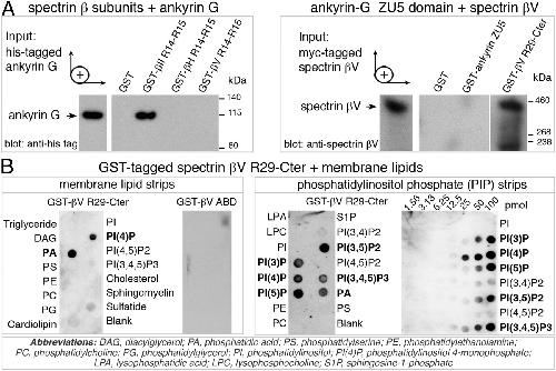 Direct interaction of spectrin βV with membrane phospholipids, but not with ankyrin G. (A) Spectrin-ankyrin interaction. (Left) Purified His-tagged ankyrin G binds to a GST-tagged R14-R15 fragment of spectrin βII (GST-βII R14-R15), but not to GST-tagged R14-R15 fragments of the human spectrin βV (GST-βV R14-R15) or Drosophila spectrin βH (GST-βH R14-R15). (Right) In the reciprocal experiment, the GST-tagged ZU5 domain of ankyrin G (GST-ankyrin ZU5) does not bind to the myc-tagged full-length human spectrin βV. Homodimerization of spectrin βV through its C-terminal region (R29-Cter) was used as a positive control (17). (B) Spectrin-membrane interaction. In a membrane lipid strip assay, the R29-Cter fragment of spectrin βV, but not its actin-binding domain (βV ABD), binds to phosphatidic acid (PA) and phosphatidylinositol 4-monophosphate [PI(4)P]. In the PIP strip assay, the βV R29-Cter peptide binds to PI(3)P, PI(4)P, and PI(5)P, to PI(3,5)P2, and to PI(3,4,5)P3. |